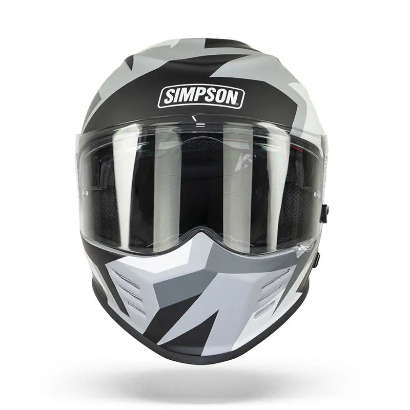 Quel est le type de casque Simpson Venom et ses principales caractéristiques ? C'est un casque de moto intégral Simpson Venom, caractérisé par un design géométrique noir mat, blanc et gris, offrant une protection maximale et un style audacieux.