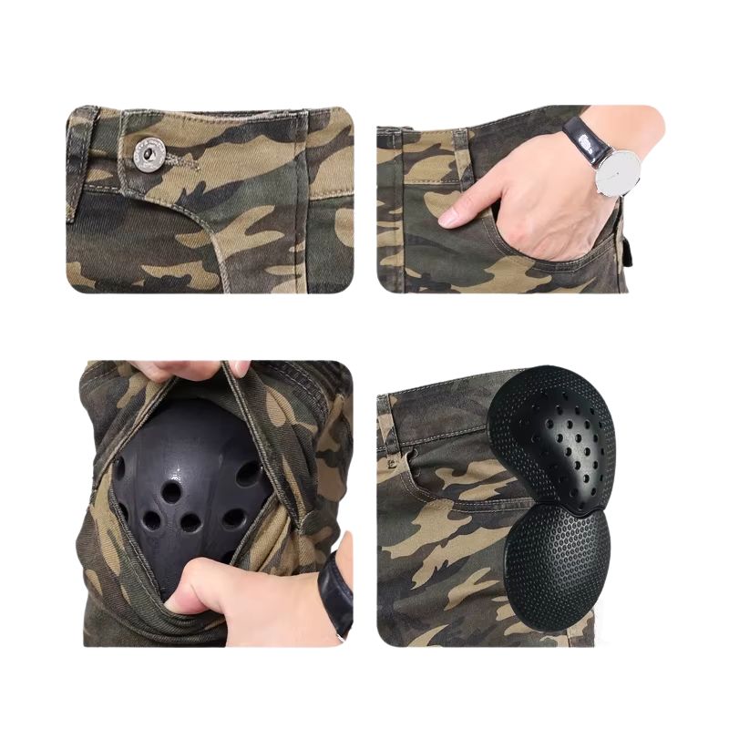 • Un design qui parle pour vous : Votre présence impose le respect avant même que vous ne parliez. Le motif camouflage, symbole de détermination, est rehaussé par les détails bikers iconiques comme les empiècements nervurés et les poches cargo. Ce n'est plus un look, c'est votre signature. Une affirmation visuelle de votre caractère indomptable.