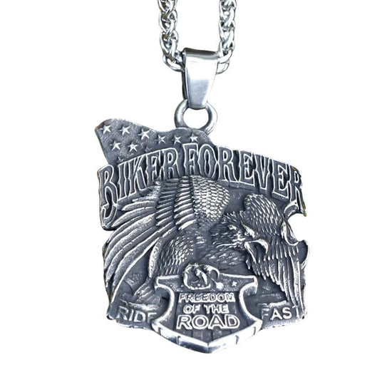 Exprimez toute votre passion de la route avec ce pendentif moto au design emblématique “Biker Forever”. Véritable hommage à l’âme libre des motards, il affiche fièrement l’aigle américain et le drapeau étoilé, symboles de puissance et d’indépendance. Conçu en acier inoxydable 316L, il offre une brillance durable et une résistance à toute épreuve, même sur les longs trajets. Ses détails minutieux lui confèrent un relief saisissant et un caractère authentique. Plus qu’un bijou, ce pendentif moto est une déclaration d’appartenance à une communauté de passionnés pour qui la route est bien plus qu’un simple chemin : c’est un mode de vie.