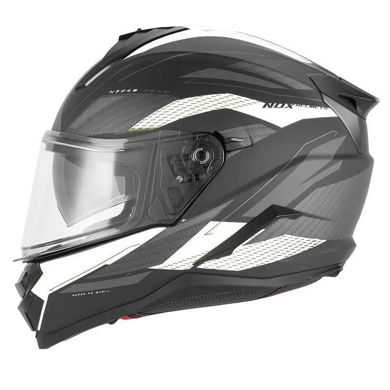 L'identité visuelle du N304S Revo est une composante intégrale de sa performance. Les motifs imitant la fibre de carbone, les bandes blanches et les accents vert fluo ne sont pas de simples ornements ; ils suivent et soulignent les lignes aérodynamiques du casque, renforçant sa géométrie agressive. Cette esthétique racing est une déclaration technique, une expression de puissance maîtrisée. À l'intérieur, les surpiqûres rouges parachèvent un design où chaque élément a une fonction : affirmer votre confiance avec précision.