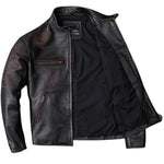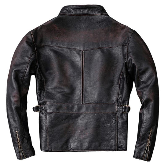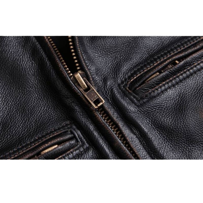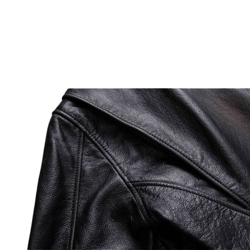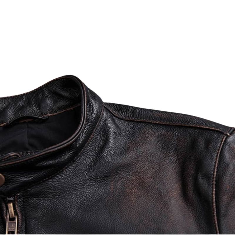 - Une armure de caractère, pas un simple look : le cuir de vachette, volontairement vieilli et patiné, n'est pas seulement une matière ; c'est une toile qui attend votre histoire. Ses nuances profondes, entre noir usé et reflets rouille, rendent chaque veste unique. Oubliez les écussons imposés : sa sobriété est une invitation à affirmer votre propre identité. Portez-la et laissez son caractère se mêler au vôtre, créant une signature qui n'appartient qu'à vous.