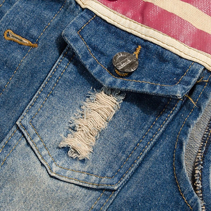 - Estetica specifica: il denim sbiadito e consumato è abbinato a un motivo floccato raffigurante la bandiera americana , il cui pigmento rosso, leggermente virante al rosa, costituisce un segno distintivo unico. Questa scelta cromatica deliberata conferisce al gilet un'identità visiva immediatamente riconoscibile.