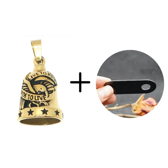 Questa campana di guardia è molto più di un semplice accessorio per moto. La leggenda narra che queste piccole campane attaccate alle moto tengano lontani gli spiriti maligni dalla strada, quelli che causano guasti e incidenti. Regalata da un amico o da una persona cara, si dice che ne amplifichi il potere protettivo. Questo particolare modello, realizzato in acciaio placcato oro, reca l'iconico motto "Vivi per guidare, guida per vivere", un mantra ben noto agli appassionati di moto che vivono la loro passione con intensità e libertà.