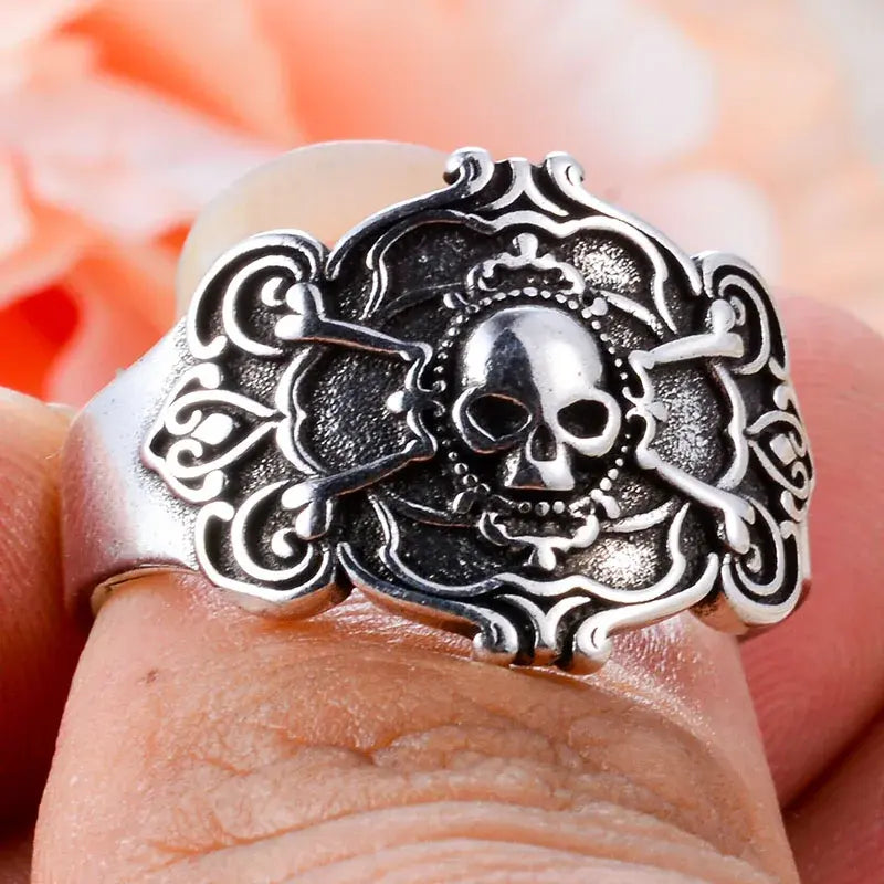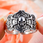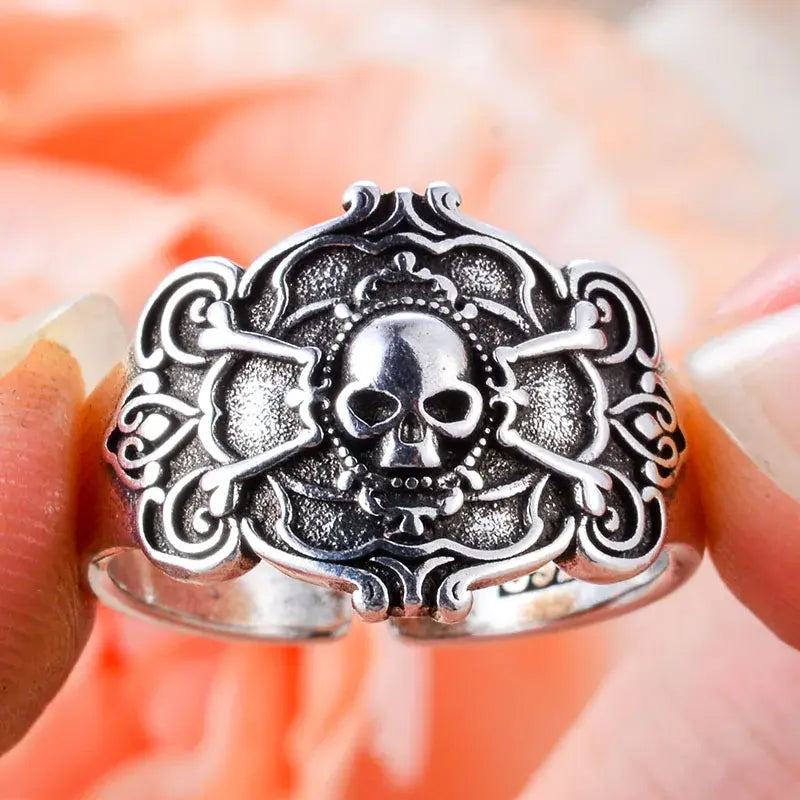 Bague biker argentée vieillie, crâne, os croisés et volutes baroques