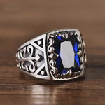 L'analyse détaillée de la Dark Crown révèle une ingénierie esthétique complexe. Le composant central est une zircone de synthèse, couleur saphir, facettée pour maximiser la réfraction de la lumière. La monture présente des motifs en relief et des arabesques géométriques dont la profondeur est accentuée par une finition oxydée. Ce traitement de surface crée un contraste élevé avec les zones polies, donnant à la pièce une patine d'inspiration antique. Le corps de la bague, large et robuste, est le châssis de cet ensemble. Chaque élément, de la composition de l'alliage à la technique de finition, a été validé pour construire une pièce dont la valeur réside autant dans sa composition matérielle que dans la force de son architecture.